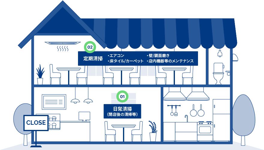 飲食店店舗様等の日常清掃や、エアコン等の定期清掃等に対応しております。お気軽にご相談ください。